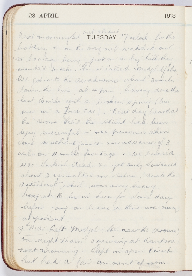 Next day heard at the 'Drome that the stunt had been very successful - 400 prisoners taken. Some machine guns & an advance of 3 miles on 11 mile frontage.