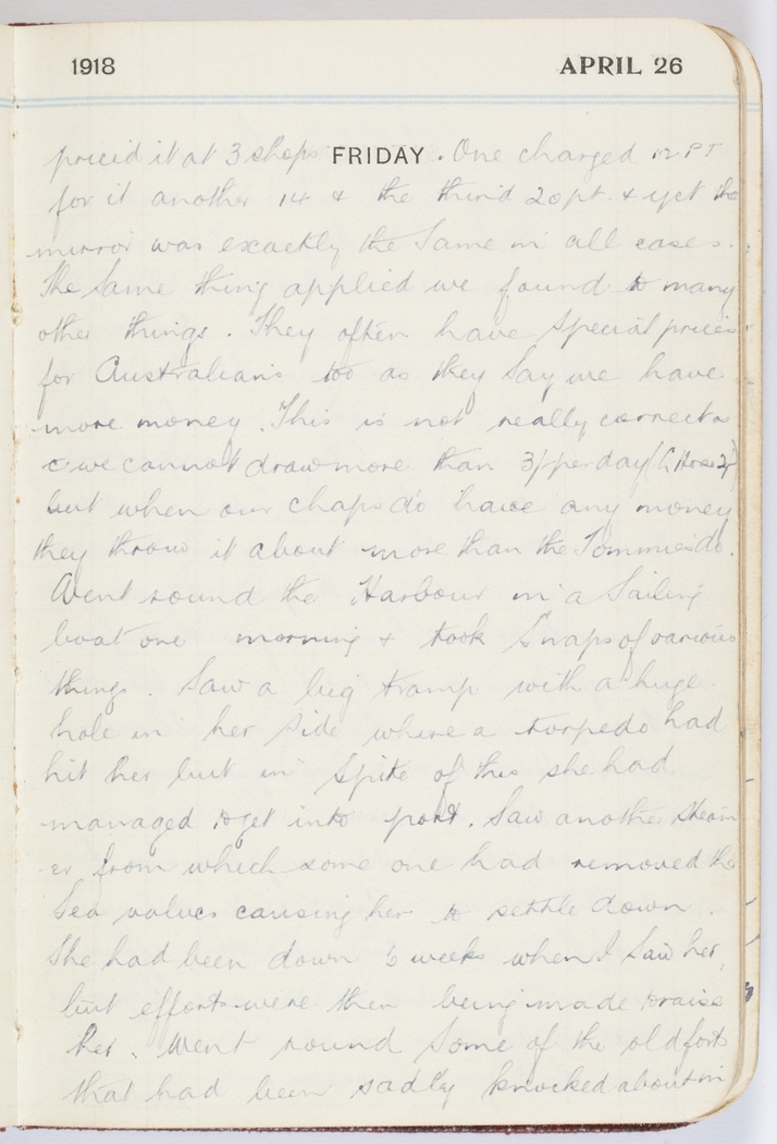Went round the Harbour in a sailing boat one morning & took snaps of various things. Saw a big tramp with a huge hole in her side where a torpedo had hit her but in spite of this she had managed to get into port. Saw another steamer from which some one had removed the sea valves causing her to settle down. She had been down 6 weeks when I saw her but efforts were then being made to raise her.