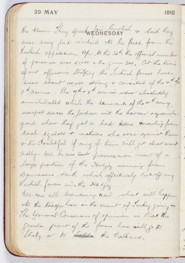 We have possession now of a large portion of the Hedjaz [Hejaz] running from Damacus south which effectively cut off any Turkish forces in the Hedjaz [Hejaz].