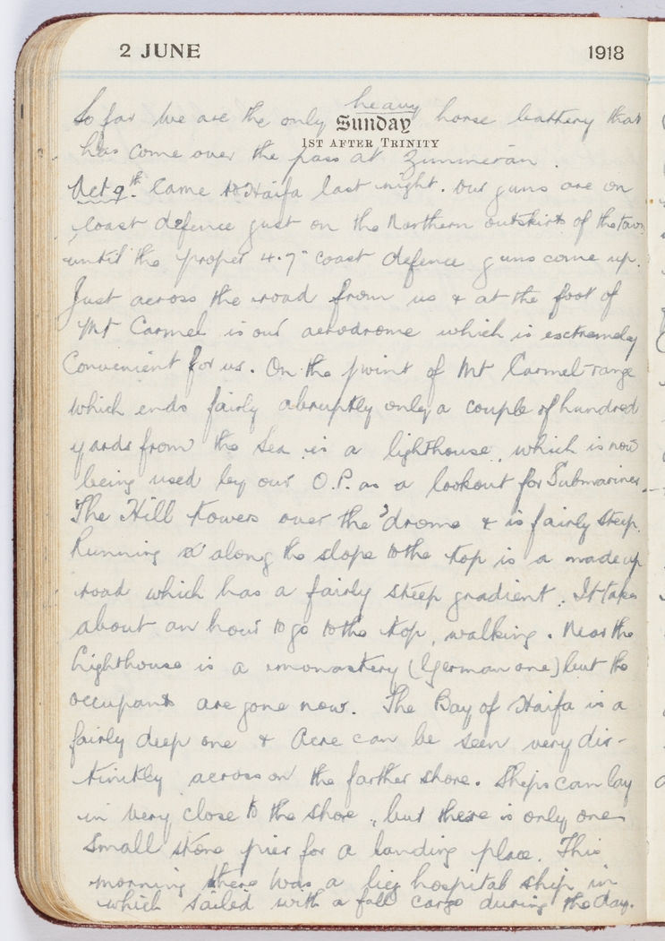 Just across the road from us & at the foot of Mt Carmel is our aerodrome which is extremely convenient for us. On the point of Mt Carmel range which ends fairly abruptly only a couple of hundred yards from the sea is a lighthouse, which is now being used by our O.P. [Observation Post] as a lookout for submarines.