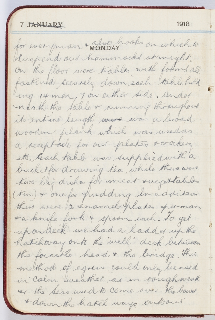 for everyman & also hooks on which to suspend our hammocks at night. On the floor were tables with forms, all fastened securely down, each table holding 14 men, 7 on either side. Underneath the table & running throughout its entire length was a broad wooden plank which was used as a receptacle for our plates & crockery etc. Each table was supplied with a bucket for drawing tea, while there were two big dishes for meat & vegetables (tin) & one for pudding. In addition there were 2 enamel plates per man & a knife, fork & spoon each. To get upon deck we had a ladder up the hatchway onto the "well" deck between the focastle head & the bridge. This method of egress could only be used in calm weather, as in rough weather the seas used to come over the bow & down the hatch way onto our