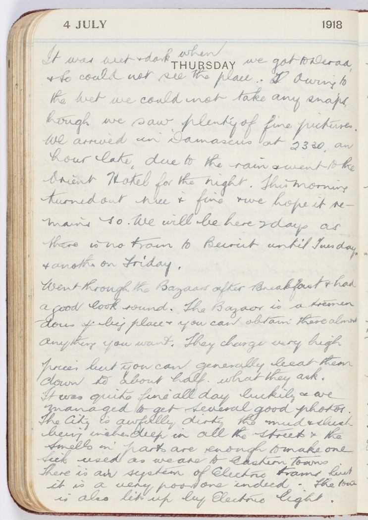 It was wet & dark when we got to Deraa, & so could not see the place. Owing to the wet we could not take any snaps though we saw plenty of fine pictures. We arrived in Damascus at 2330, an hour late, due to the rain & went to the Orient Hotel for the night.