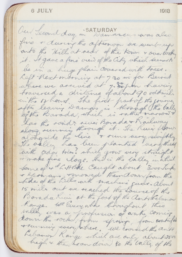 Left next morning at 7.30 for Beirut where we arrived at 7.00 pm having traversed a distance of about 90 odd miles in the 12 hours. The first part of the journey after leaving Damas is through the Valley of the Barada, which is rather narrow & has the road, river Barada & Railway running through it.