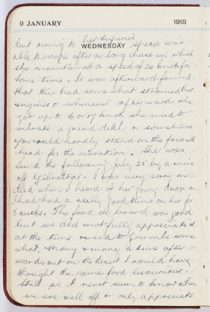 but owing to her superior speed was able to escape after a long chase in which she maintained a speed of 20 knots for some time. It was afterwards found that this had some what strained her engines & whenever afterwards she got up to 16 or 17 knots she used to vibrate a gread deal & sometimes you could hardly stand on the focastle head for the vibration. She was Sunk the following July 25 by a mine off Gibraltar. I was very sorry indeed when I heard of her going down as I had had a really good time on her for 5 weeks. The food on board was good but we did not fully appreciate it at the time & used to grumble some what. Many & many a time afterwards out on the desert I would have thought the same food luxurious. Still we never seem to know when we are well off & only appreciate