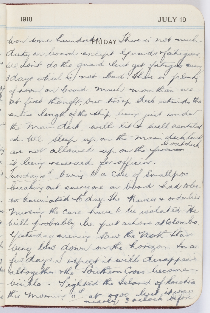 Owing to a case of smallpox breaking out everyone on board had to be vacinated today. The Nurses & orderlies nursing the case have to be isolated. He will probably be put ashore at Colombo.