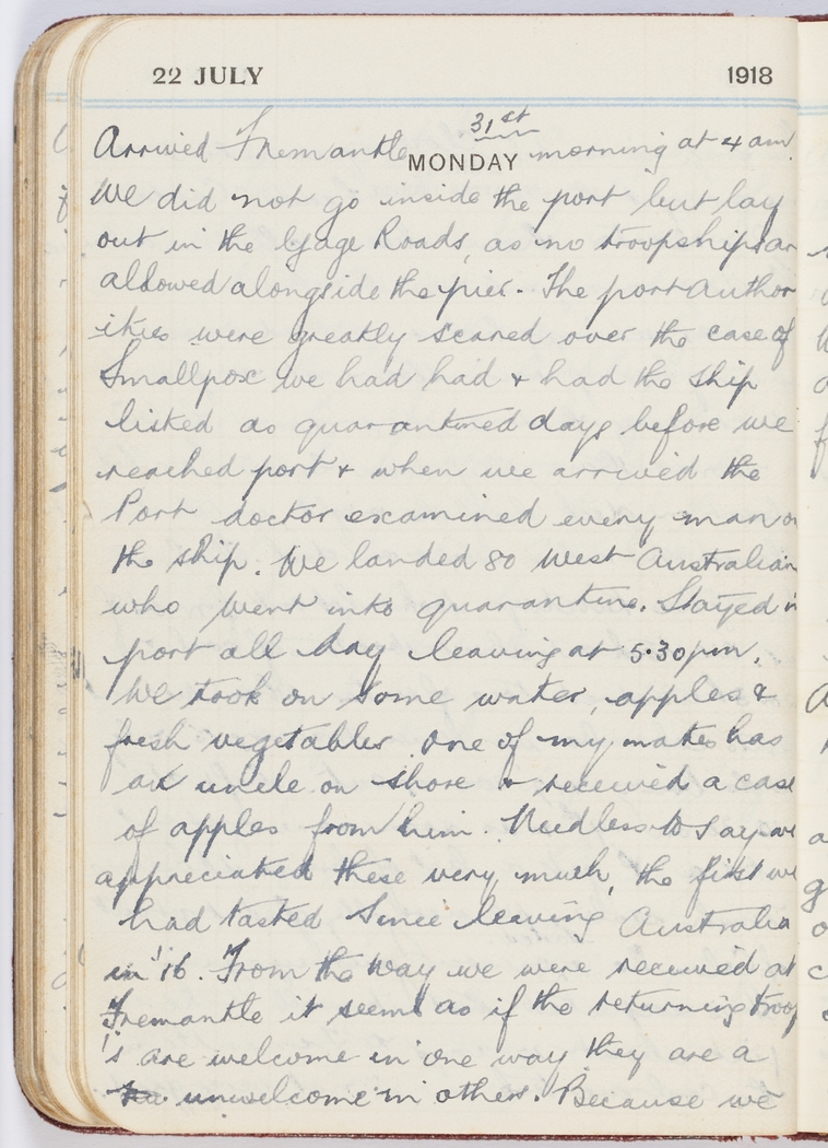 Arrived Fremantle 31st morning at 4 am. We did not go inside the port but lay out in the Gage Roads, as no troopships are allowed alongside the pier. The port authorities were greatly scared over the case of smallpox we had had & had the ship listed as quarantined days before we reached port & when we arrived the Port doctor examined every man on the ship.
