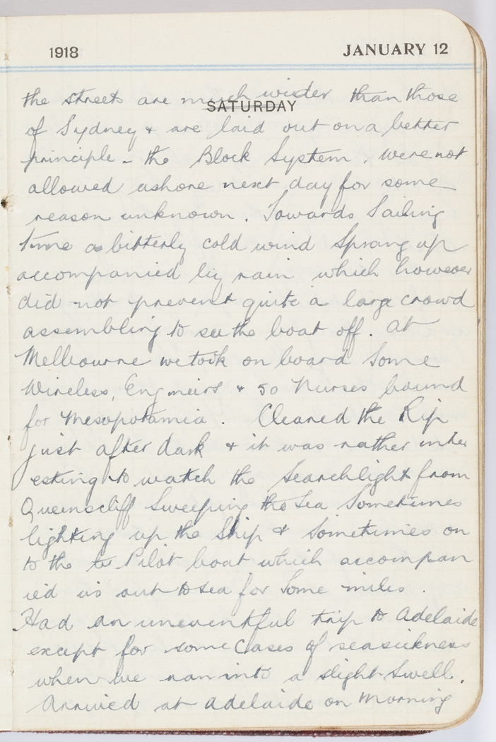 the streets are much wider than those of Sydney & are laid out on a better principle - the Block System. Were not allowed ashore next day for some reason unknown. Towards sailing time a bitterly cold wind sprang up accompanied by rain which however did not prevent quite a large crowd assembling to see the boat off. At Melbourne we took on board some Wireless, Engineers & 50 nurses bound for Mesopotamia. Cleared the Rip just after dark & it was rather interesting to watch the searchlight from Queenscliff sweeping the sea sometimes lighting up the ship & sometimes on to the Pilot boat which accompanied us out to sea for some miles.