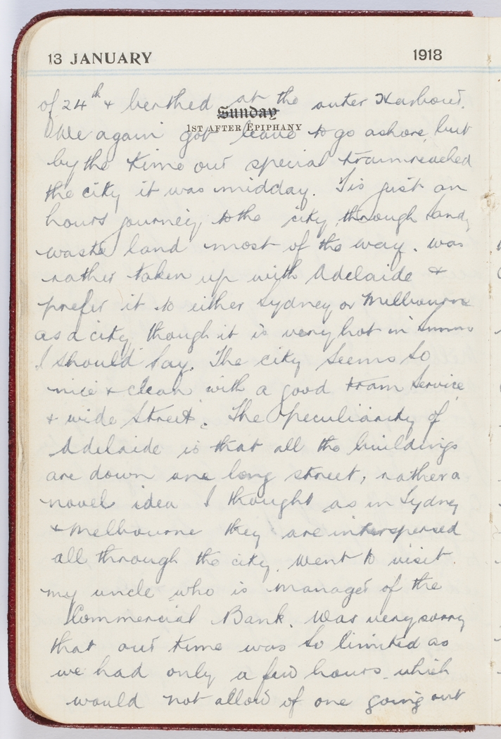 of 24th & berthed at the outer Harbour. We again got leave to go ashore, but by the time our special train reached the city it was midday. Tis just an hours journey to the city, through sandy waste land most of the way. Was rather taken up with Adelaide & prefer it to either Sydney or Melbourne as a city though it is very hot in summer I should say. The city seems so nice & clean, with a good tram service & wide sreet. The peculiarity of Adelaide is that all the buildings are down one long street, rather a novel idea I thought as in Sydney & Melbourne they are intersperced all through the city. Went to visit my uncle who is manager of the Commercial Bank. Was very sorry that our time was so limited as we had only a few hours which would not allow of one going out
