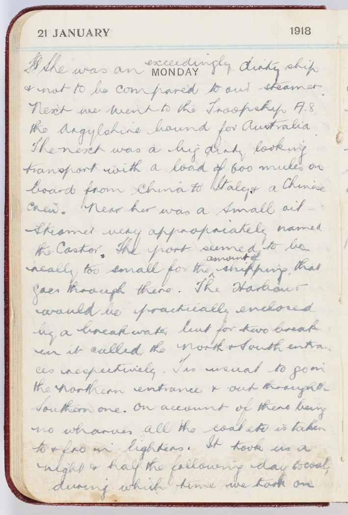 Next we went to the Troopship A8, the Argyleshire bound for Australia. The next was a big dirty looking transport with a load of 600 mules on board from China to Italy & a Chinese crew. Near her was a small oil-steamer vey appropriately named the Castor.