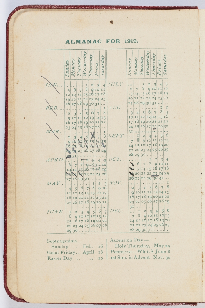 Printed Almanac For 1919 with some dates crossed out by hand.