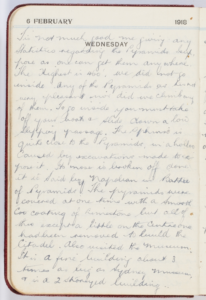 The Sphinx is quite close to the Pyramids, in a hollow caused by excavations made to expose it. Its nose is broken off, done it is said by Napoleon in Battle of Pyramids.