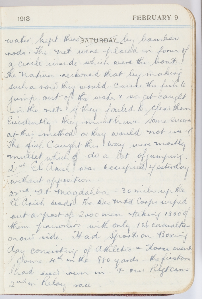 22nd At Magdahlia - 30 miles up the El Arish wadi the Des Mtd Corps wiped out a post of 2,000 men taking 1,350 of them prisoners with only 136 casualties on our side.