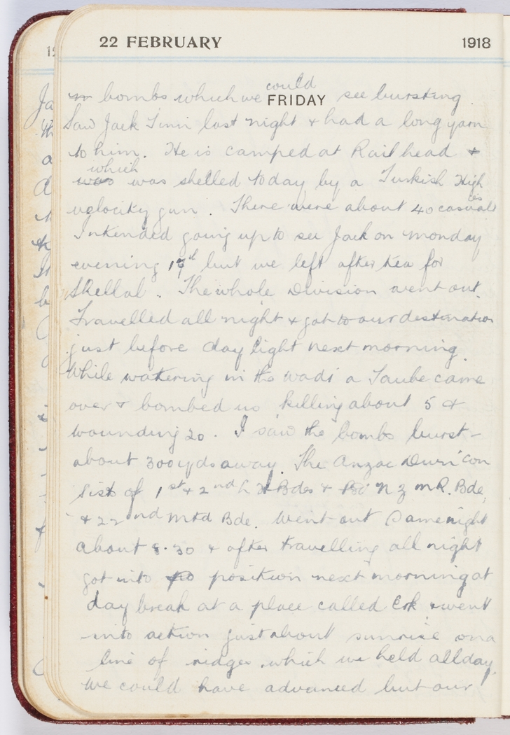 Saw Jack Finn last night & had a long yarn to him. He is camped at Railhead which was shelled today by a Turkish high velocity gun. There were about 40 casualties.