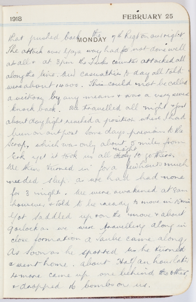 We were awakened at 8 am however & told to be ready to move in 15 min. Got saddled up & on the move & about 9 oclock as we were travelling along in close formation a Taube came along. As soon as he spotted us he turned & went home. About half an hour later 4 more came up one behind the other & dropped 16 bombs on us.