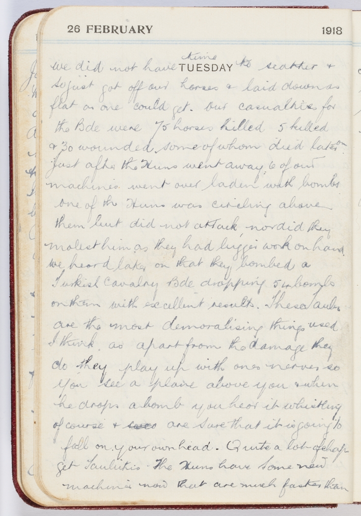 Just after the Huns went away, 6 of our machines went over laden with bombs, one of the Huns was circling above them but did not attack, nor did they molest him as they had bigger work on hand. We heard later on that they bombed a Turkish Cavalry Bde, dropping 54 bombs on them with excellent results.