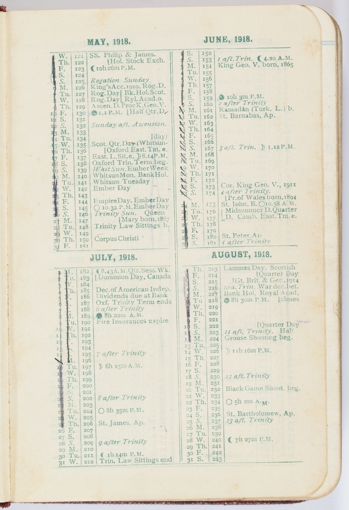 Printed page covering (mainly) Christian dates for May, June, July, August 1918 with some crossed out by hand.
