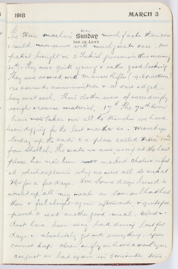 Our patrol brought in 2 Turkish prisoners this morning (14th). They were quite young & rather good looking. They were armed with Mauser Rifles (1916 pattern) 120 rounds ammunition & a saw edged bayonet each. There clothes were exceedingly rough & coarse material.