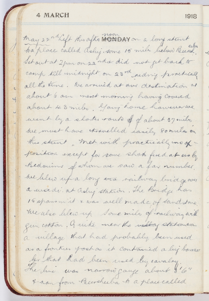 We blew up a long railway bridge over a wadi at Asluj station. The Bridge has 15 spans in it & was well made of sandstone. We also blew up some miles of railway with gun cotton.