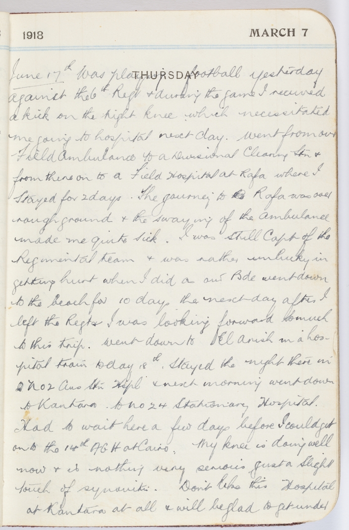 Was playing football yesterday against the 6th Regt & during the game I received a kick on the right knee which necessitated me going to hospital next day.