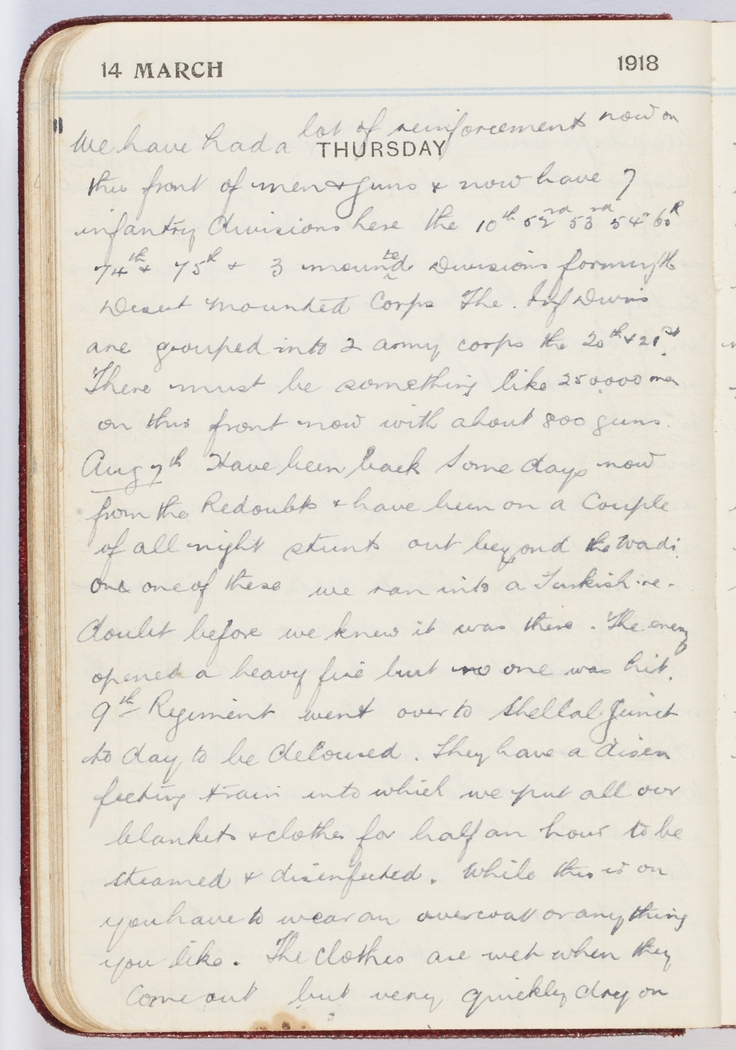 Have been back some days now from the Redoubts & have been on a couple of all night stunts out beyond the wadi, on one of these we ran into a Turkish redoubt before we knew it was there. The enemy opened a heavy fire but no one was hit.