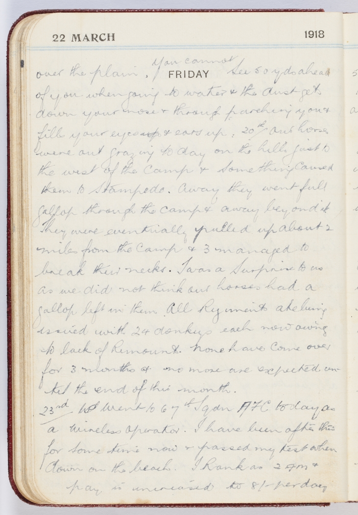 Our horses were out grazing today on the hills just to the west of the camp & something caused them to stampede. Away they went full gallop through the camp & away beyond it.
