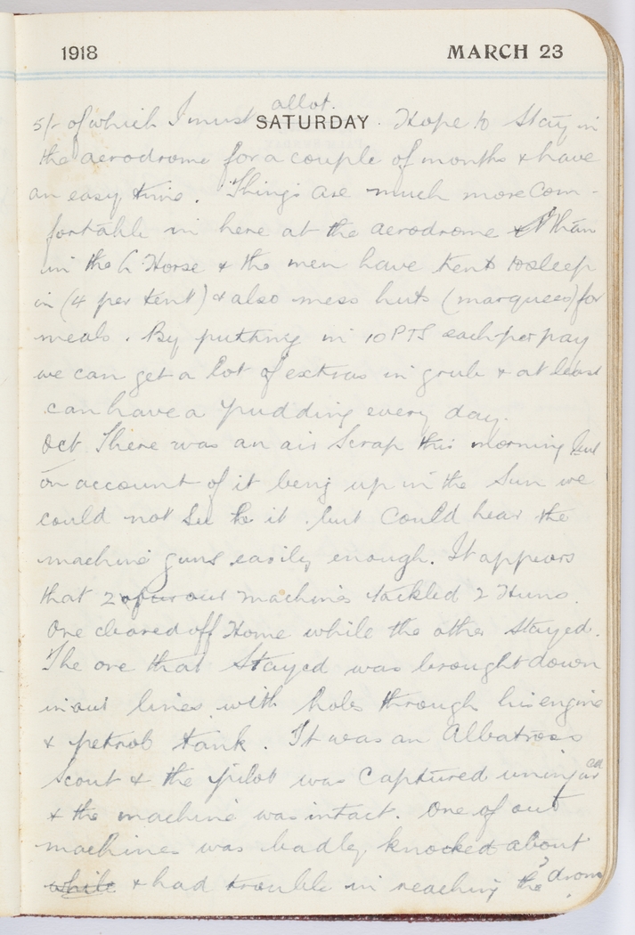 The one that stayed was brought down in our lines with holes through his engine & petrol tank. It was an Albatross Scout & the pilot was captured uninjured & the machine was intact.