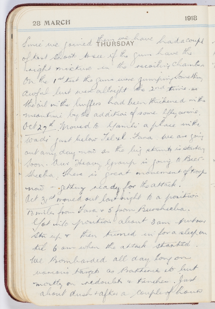 Moved to Gamli [El Gamli] a place in the Wadi just below Tel-el-Fara. We are going out any day now as the big stunt is starting soon. Our Heavy group is going to Beersheeba [Beersheba] . There is great movement of troops now - getting ready for the attack.