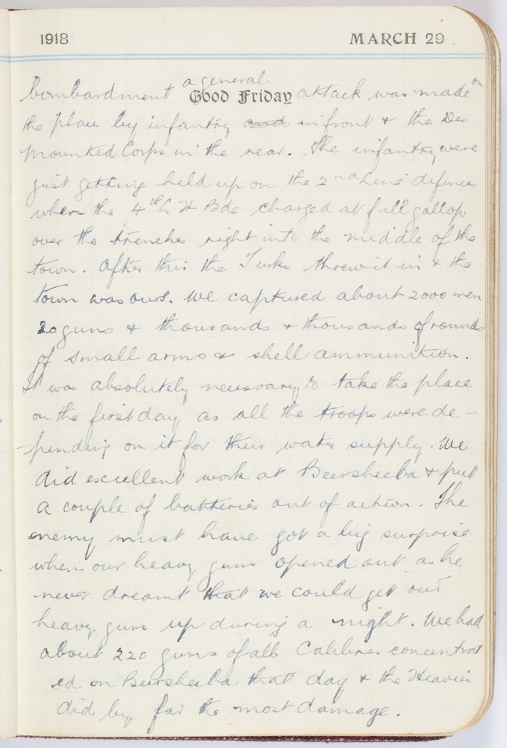 It was absolutely necessary to take the place on the first day as all the troops were depending on it for their water supply. We did excellent work at Beersheeba [Beersheba] & put a couple of batteries out of action.