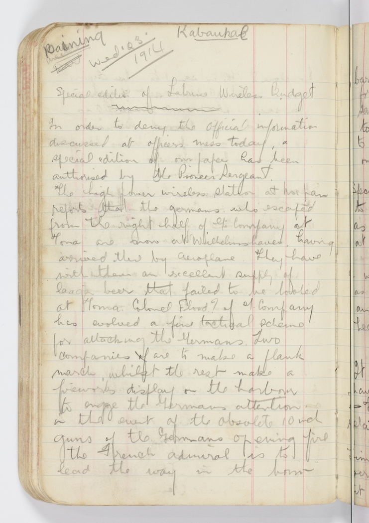The high power wireless station at Bita Paka reports that the germans who escaped from the right half of G Company at Toma are now at Wilhelmshaven, having arrived there by aeroplane. They have with them an excellent supply of lager beer that failed to be looted at Toma. Colonel Flood.? of G Company has evolved a fine tactical scheme for attacking the Germans. Two companies of are to make a flank march, whilst the rest make a fireworks display on the harbour to engage the Germans attention in the event of the obsolete 10 inch guns of the Germans opening fire. the French admiral is to lead the way in the bom-