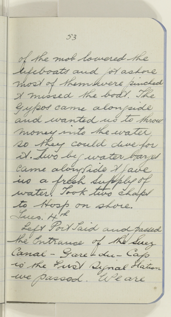 of the mob lowered the lifeboats and got ashore most of them were pinched & missed the boat. The Gypos came alongside and wanted us to throw money into the water so they could dive for it. Two big water barges came alongside & gave us a fresh Supply of water. Took two chaps to Hosp on shore.