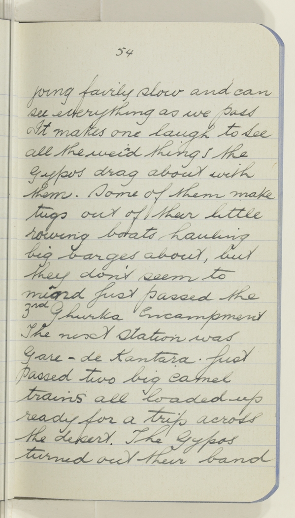 going fairly slow and can see everything as we pass It makes one laugh to see all the weird things the Gypos drag about with them. Some of them make tugs out of their little rowing boats hauling big barges about, but they don't seem to mind Just passed the 3rd Ghurka Encampment The next station was Gare - de Kantara. Just passed two big camel trains all loaded up ready for a trip across the desert. The Gypos turned out their band