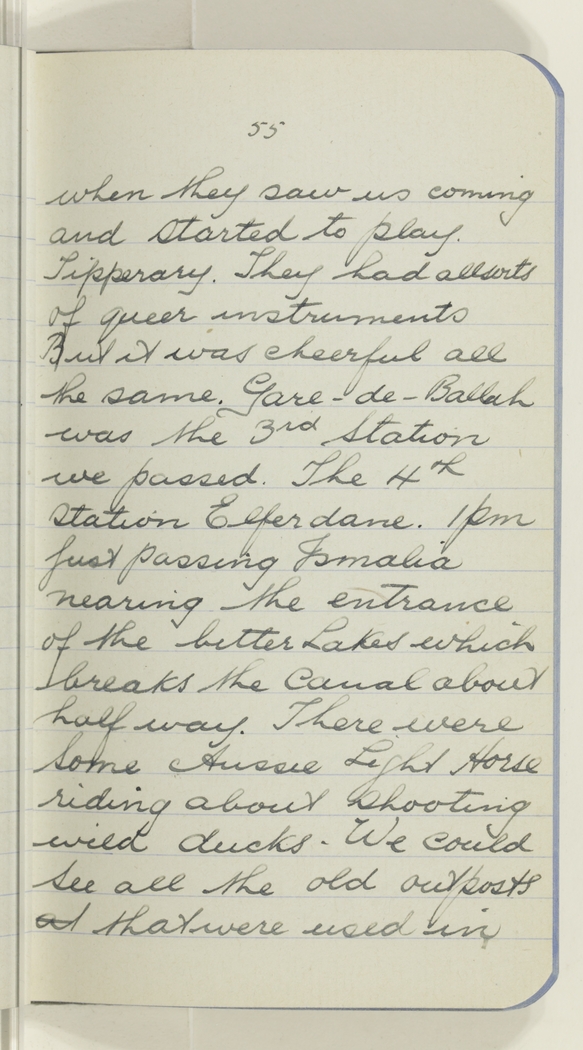 when they saw us coming and started to play Tipperary. They had allsorts of queer instruments But it was cheeful all the same. Gare - de - Ballah was the 3rd Station we passed. The 4th Station [Elferdane]. 1 pm Just passing Ismalia nearing the entrance of the better Lakes which breaks the Canal about halfway. There were Some Aussie Light Horse riding about shooting wild ducks. We could see all the old outposts al that were used in