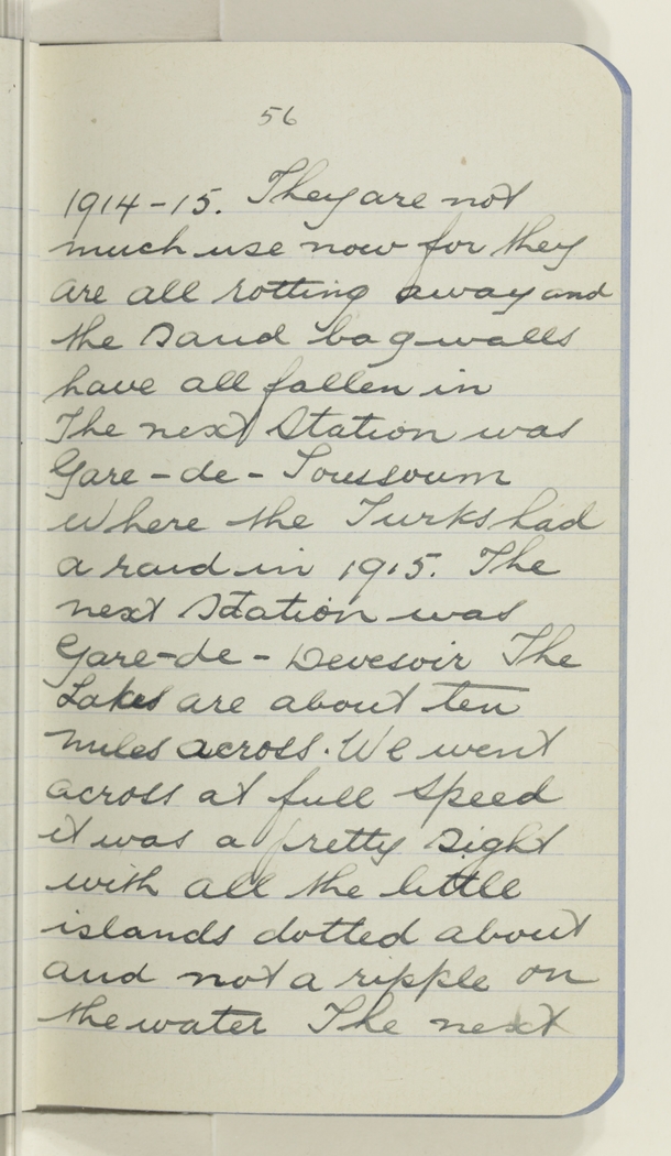 1914 - 15 They are not much use now for they are all rotting away and the sand bag walls have all fallen in The next Station was Gare - de - Toussoum Where the Turks had a raid in 1915. The next Station was Gare - de - Devesoir The Lakes are about ten miles across. We went across at full speed it was a pretty sight with all the little islands dotted about and not a ripple on the water The next