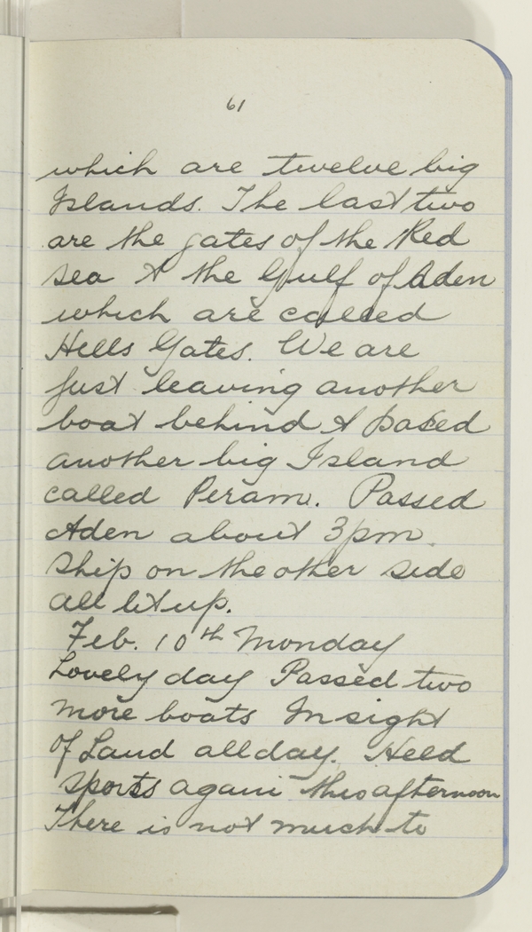 which are twelve big Islands. The last two are the gates of the Red sea & the Gulf of Aden which are called Hells Gates. We are just leaving another boat behind & pased another big Island called Piram. Passed Aden about 3pm Ships on the other side all lit up.