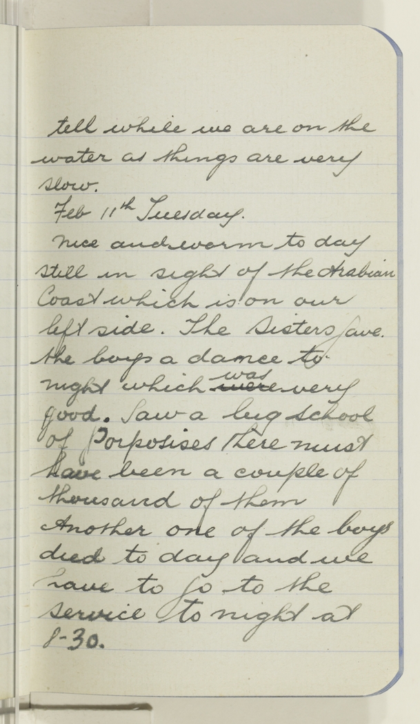 nice and warm to day still in sight of the Arabian Coast which in on our left side. The Sisters gave the boys a dance to night which were was very good. Saw a big school of Porposises there must have been a couple of thousand of them Another one of the boys died to day and we have to go to the service to night at 8-30.