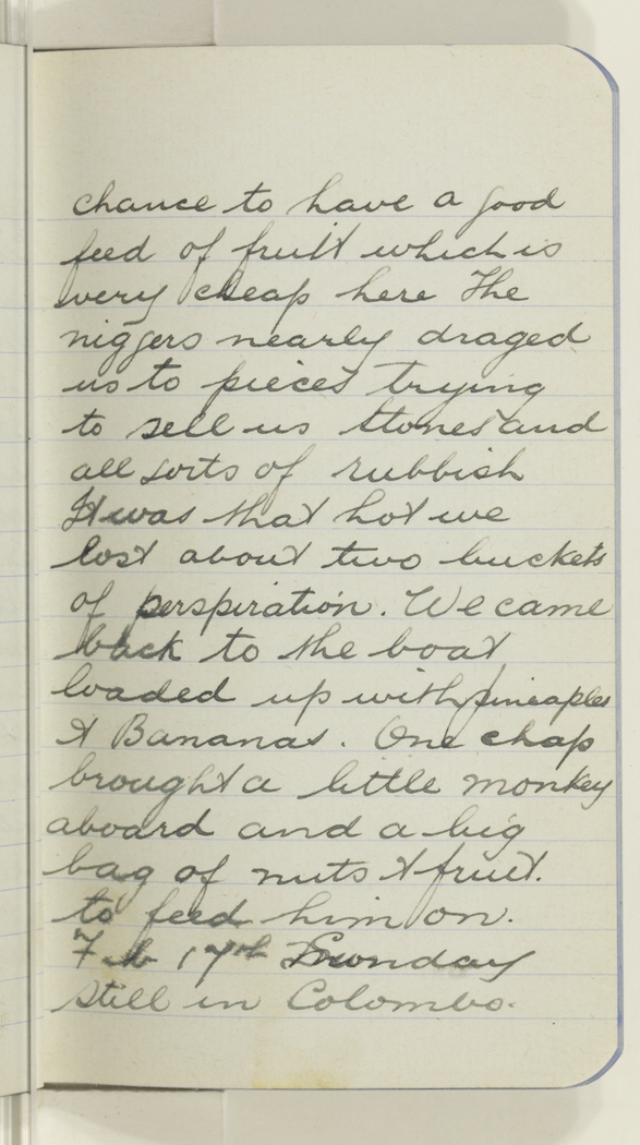 chance to have a good feed of fruit which is very cheap here The niggers nearly draged us to pieces trying to sell us stones and all sorts of rubbish It was that hot we lost about two buckets of perspiration. We came back to the boat loaded up with pineaples & Bananas. One chap brought a little monkey aboard and a big bag of nuts & fruit. to feed him on.