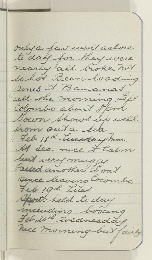 only a few went ashore to day for they were nearly all broke. Not so hot Been loading pines & Bananas all the morning. Left Colombo about 8 pm Town shows up well from out a sea