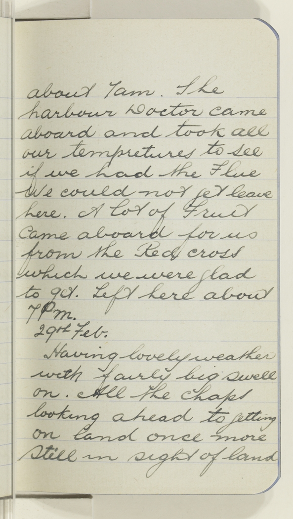 about 7am. The harbour Doctor came aboard and took all our tempretures to see if we had the Flue We could not get leave here. A lot of fruit came aboard for us from the Red cross which we were glad to get. Left here about 7 Pm.