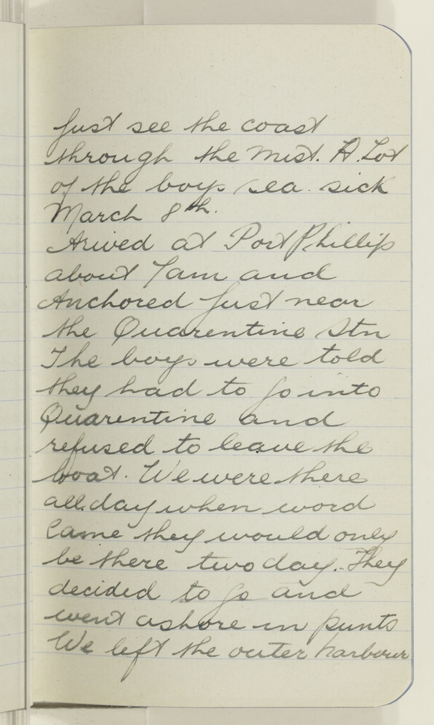 Arived at Port Phillip about 7 am and Anchored just near the Quarentine Stn The boys were told they had to go into Quarentine and refused to leave the boat. We were there all day when word came they would only be there two day. They decided to go and went ashore in punts We left the outer harbour