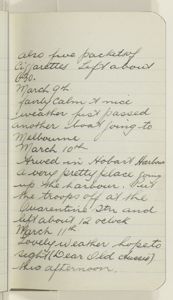 Arived in Hobart harbour a very pretty place going up the harbour. Put the troops off at the Quarentine Stn and left about 12 oclock