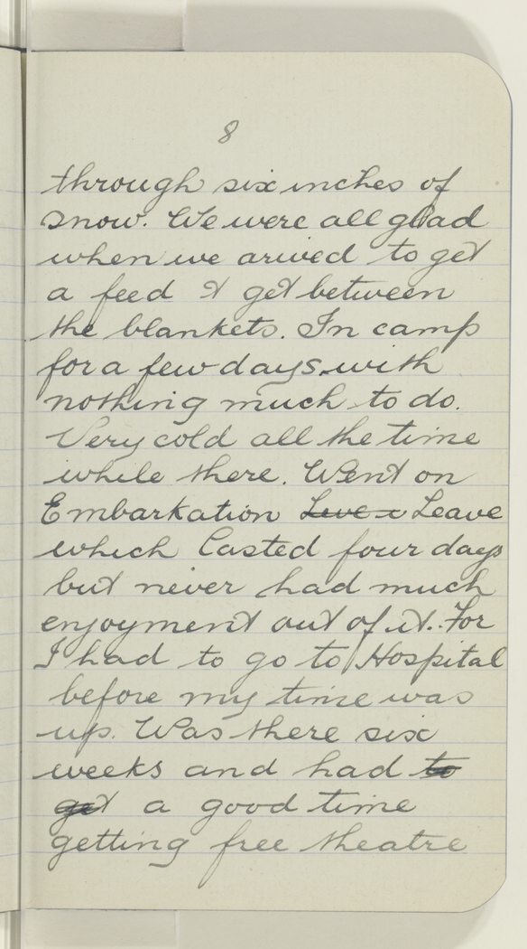 through six inches of snow. We were all glad when we arived to get a feed & get between the blankets. In camp for a few days with nothing much to do. Very cold all the time while there. Went on Embarkation Live i Leave which Lasted four days but never had much enjoyment out of it. For I had to go to Hospital before my time was up. Was there six weeks and had to get a good time getting free theatre