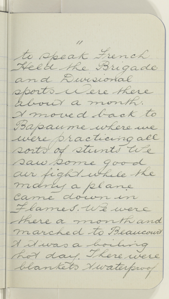 to speak French Held the Brigade and Divisional sports Were there about a month. & moved back to Bapaume where we were practicing all sorts of stunts We saw some good air fight while the many a plane came down in Flames. We were there a month and marched to Beaucourt & it was a boiling hot day. There were blankets & waterproof