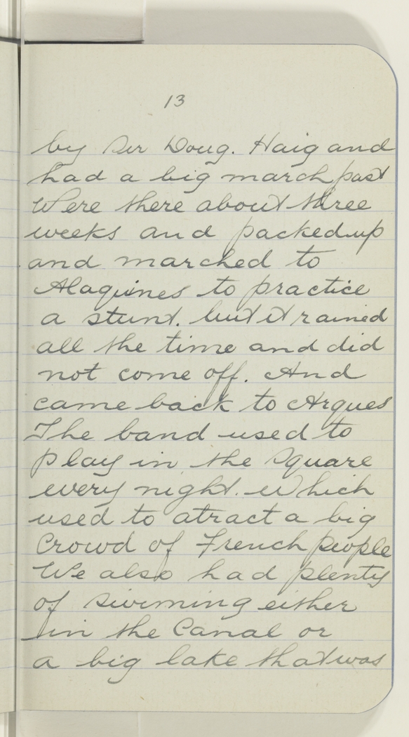 by Sir Doug. Haig and had a big march past Were there about three weeks and packed up and marched to Alaquines to practice a stunt. but it rained all the time and did not come off. And came back to Arques The band used to play in the Square every night. Which used to atract a big crowd of French people We also had plenty of swiming either in the Canal or a big lake that was