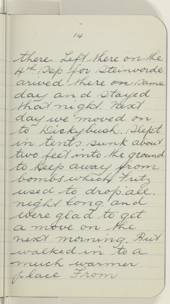 there. Left there on the 4th Sep for Steinvorde [Steenvoorde] arived there on same day and stayed that night. next day we moved on to Diskybush. Slept in tents sunk about two feet into the ground to keep away from the bombs which Fritz used to drop. all. night long. and were glad to get a move on the next morning. But walked in to a much warmer place From