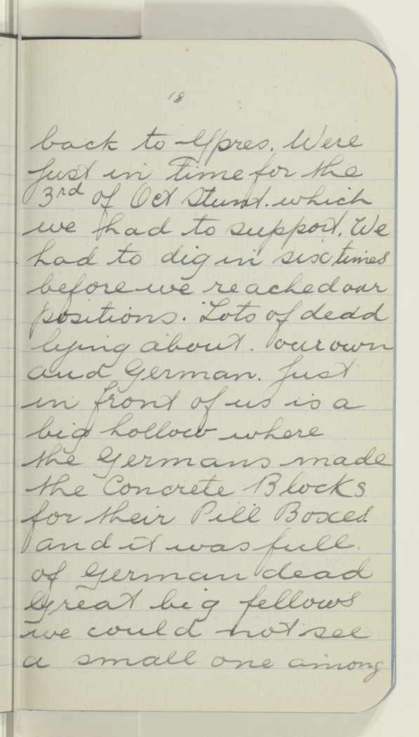 back to Ypres. Were first in time for the 3rd Oct Stunt. which we had to support. We had to dig in six times before we reached our positions. Lots of dead lying about. our own and German. Just in front of us is a big hollow where the Germans made the Concrete Blocks for their Pill Boxes. and it was full of German dead Great big fellows we could not see a small one among
