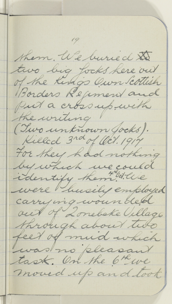 them. We buried to two big jocks here out of the Kings Own Scottish Borders Regiment and put a cross up with the writing (Two unknown Jocks). Killed 3rd of Oct. 1917 For they had nothing by which we could identify them. 4th Oct. We were busily employed carrying wounded out to Zonebeke [Zonnebeke] Village through about two feet of mud which was no pleasant task. On the 6th we moved up and took