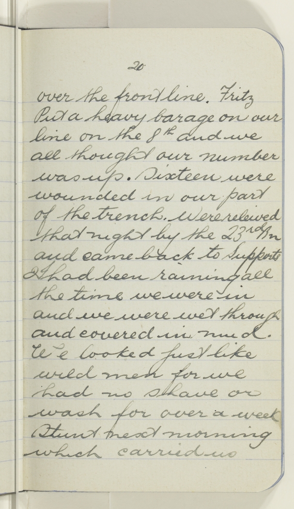 over the frontline. Fritz Put a heavy barage on our line on the 8th and we all thought our number was up. Sixteen were wounded in our part of the trench. Were releived that night by the 23rd Bn and came back to Supports It had been raining all the time we were in and we were wet through and covered in mud. We looked just like wild men for we had no shave or wash for over a week Stunt next morning which carried us