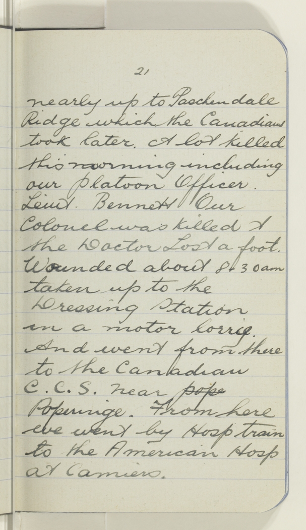 nearly up to Paschendale Ridge which the Canadians took later. A lot killed this morning including our platoon Officer. Leiut. Bennett Our Colonel was killed & the Doctor Lost a foot. Wounded about 8-30 am taken up to the Dressing Station in a motor lorry. And went from there to the Canadian C.C.S. near pope Poperinge. From here we went by Hosp train to the American Hosp at Camiers.