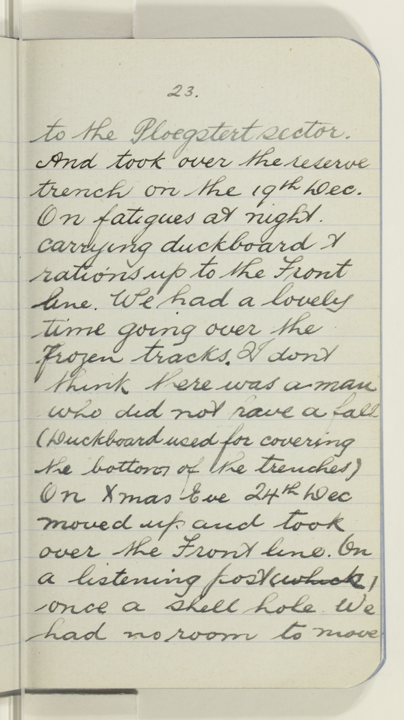 to the Ploegstert sector. And took over the reserve trench on the 19th Dec. On fatigues at night. carrying duckboard & rations up to the Front line. We had a lovely time going over the frozen tracks. I dont think there was a man who did not have a fall (Duckboard used for covering the bottom of the trenches) On Xmas Eve 24th Dec moved up and took over the Front line. On a listening post (which) - once a shell hole. We had no room to move