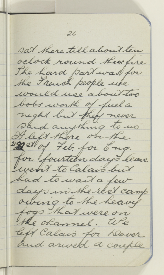 sat there till about ten oclock round their fire The hard part was for the French people we would use about two bobs worth of fuel a night but they never said anything to us I left there on the 22 21st of Feb. for Eng. for fourteen days leave went to Calais but had to wait a few days in the rest camp owing to the heavy fogs that were on the channel. We left Calais for Dover and arived a couple